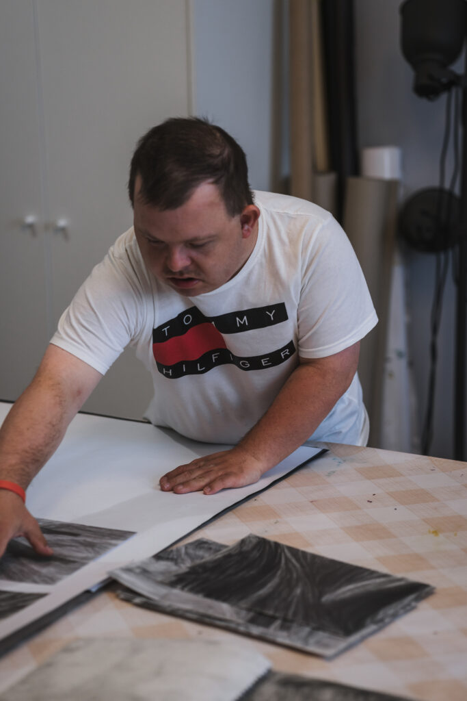 łagodność, spokój jasnego spojrzenia, skromność i uśmiech pełen ciepła którym szczodrze obdarza wszystkie osoby wchodzące w bezpośrednią relację – to w opisowym  skrócie portret Tomasza, który jest od 2024r uczestnikiem środowych spotkań warsztatowych dla osób z niepełnosprawnościami w Galerii Tak .